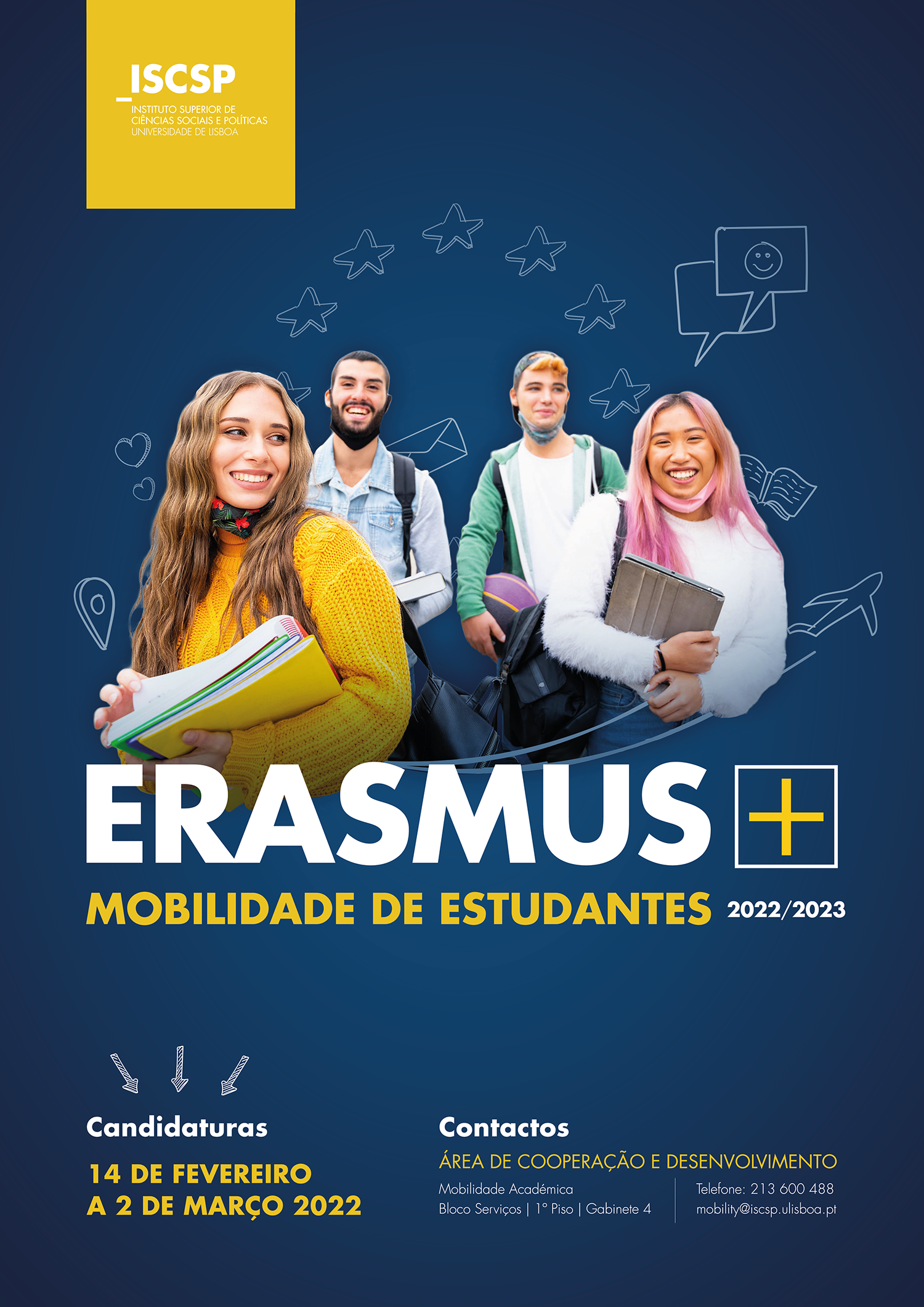 Estão abertas, entre 14 de fevereiro e 2 de março de 2022, as candidaturas ao Programa Erasmus+ para o ano letivo 2022/2023, para os alunos do ISCSP-ULisboa.