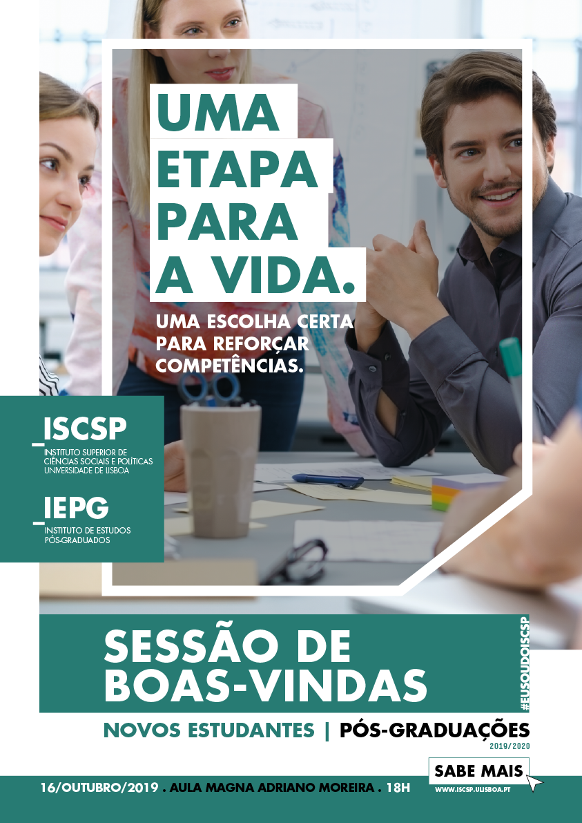 Decorre no dia 16 de outubro de 2019, uma Welcome Session destinada a todos os alunos participantes nas Pós-Graduações do ISCSP. A sessão terá lugar na Aula Magna Professor Adriano Moreira do ISCSP-ULisboa, às 18 horas.