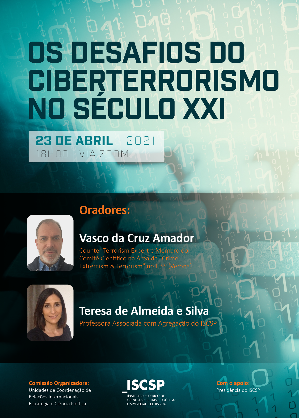 Vasco da Cruz Amador, CEO da Global Intelligence Insight e Teresa de Almeida e Silva, professora do ISCSP-ULisboa, serão os oradores convidados e irão analisar a internet como ferramenta de disseminação, propaganda, radicalização e recrutamento por parte de algumas organizações terroristas.