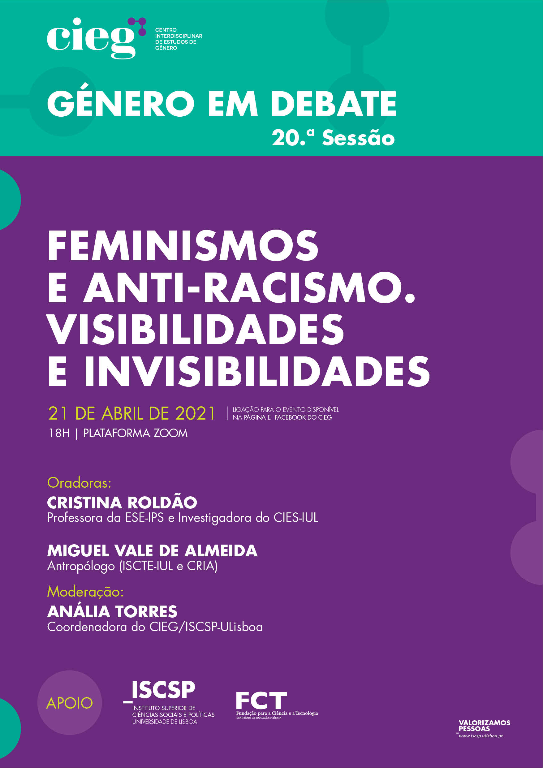 Acontece no dia 21 de abril de 2021, às 18 horas, mais uma edição do Ciclo Género em Debate, dedicada ao tema “Feminismos e anti-racismo. Visibilidades e invisibilidades”.