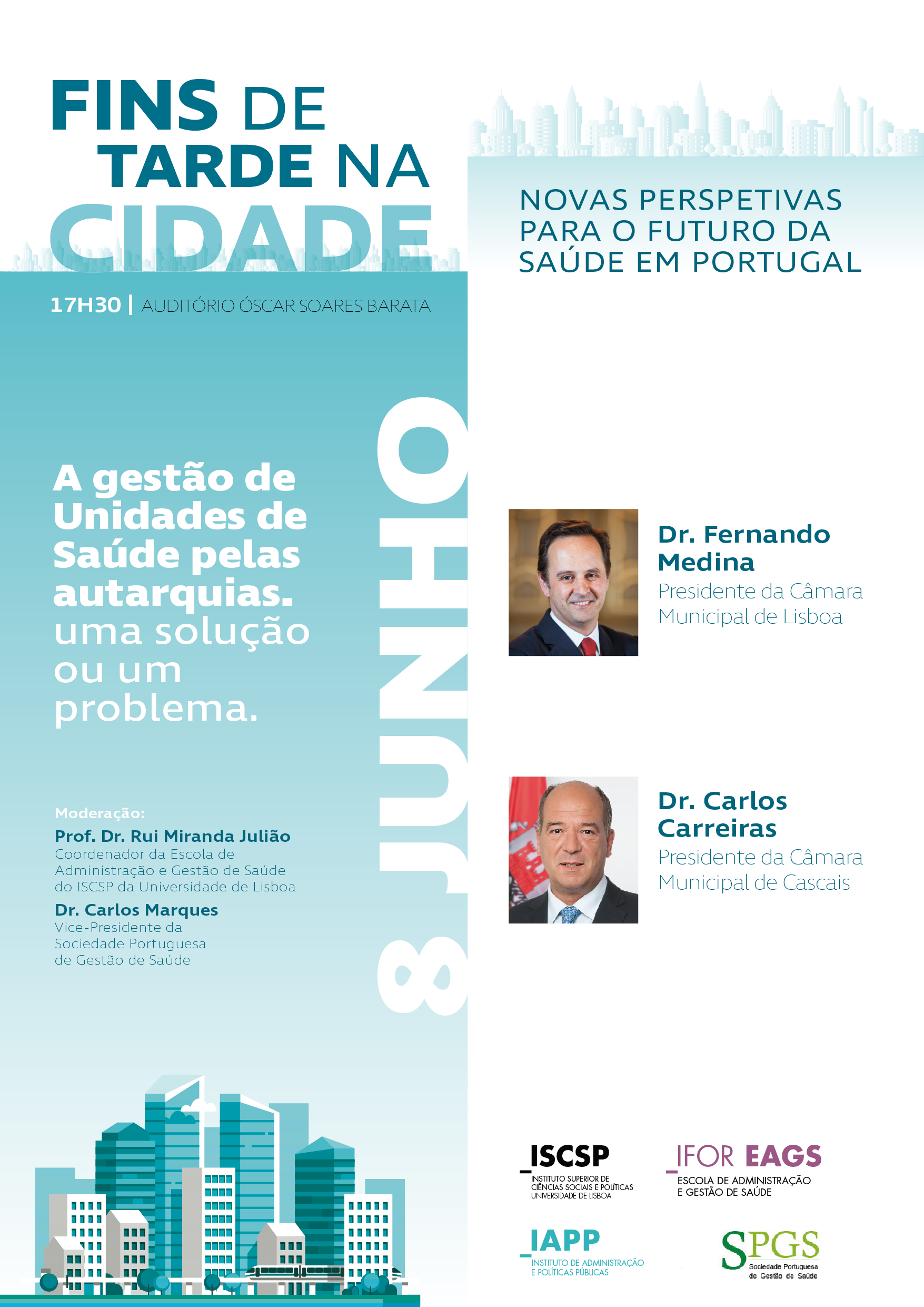 A conferência “A gestão de Unidades de Saúde pelas autarquias - Uma solução ou um problema”, assinala o encerramento do ciclo de conferências, “Fins de tarde na cidade. Novas perspetivas para o futuro da saúde em Portugal", no dia 8 de junho, às 17h30, no Auditório Óscar Soares Barata, do ISCSP-ULisboa. A sessão será presencial, mas com transmissão por videoconferência.