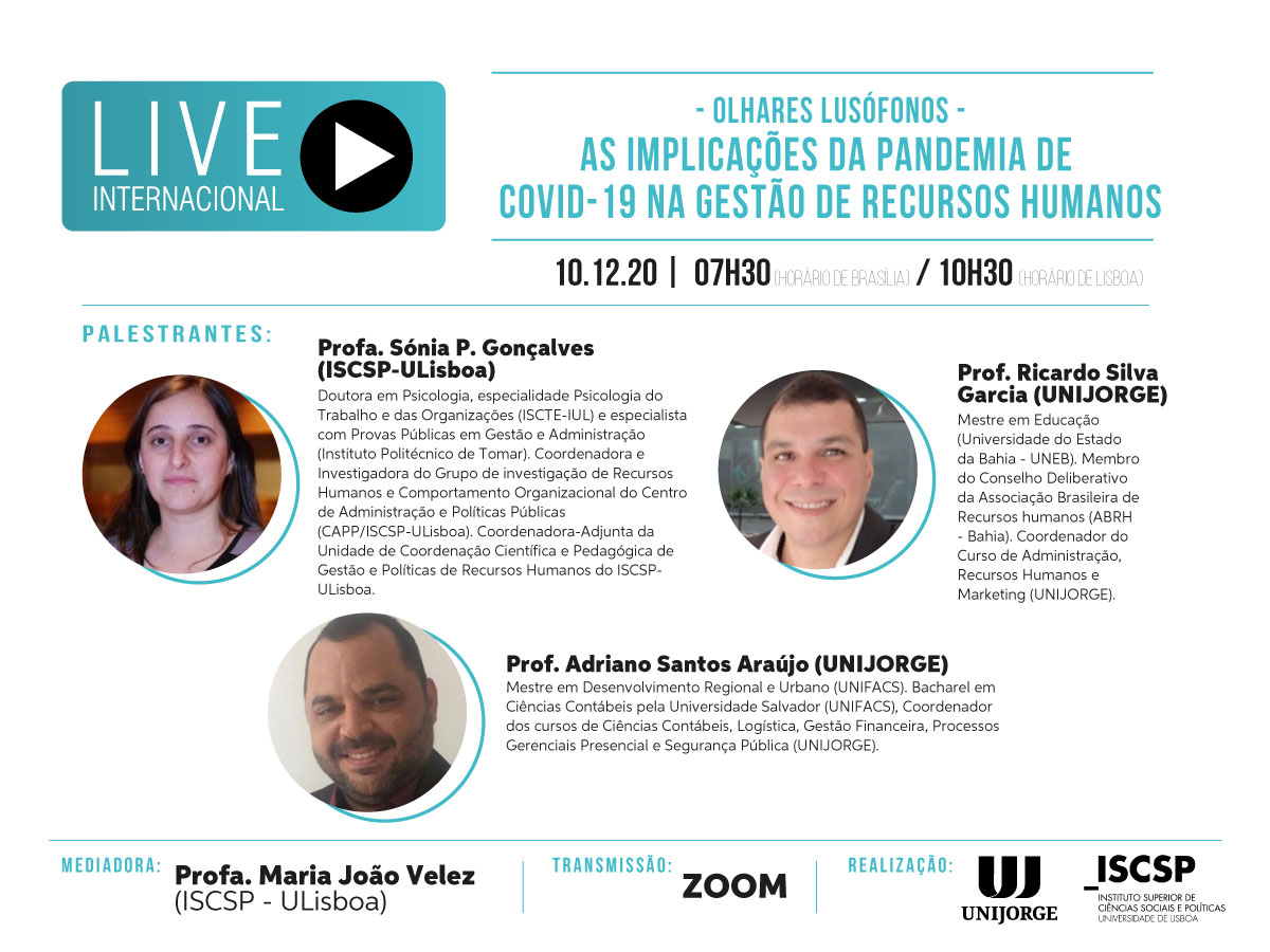 No próximo dia 10 de dezembro de 2020 realiza-se, pelas 10h30, um debate internacional sob o tema “Olhares Lusófonos – As implicações da Pandemia de Covid-19 na Gestão de Recursos Humanos”, organizado pela UNIJORGE (Brasil) e pela Área de Cooperação e Desenvolvimento do ISCSP-ULisboa, com a intervenção da Unidade de Coordenação de Gestão de Recursos Humanos do ISCSP-ULisboa.