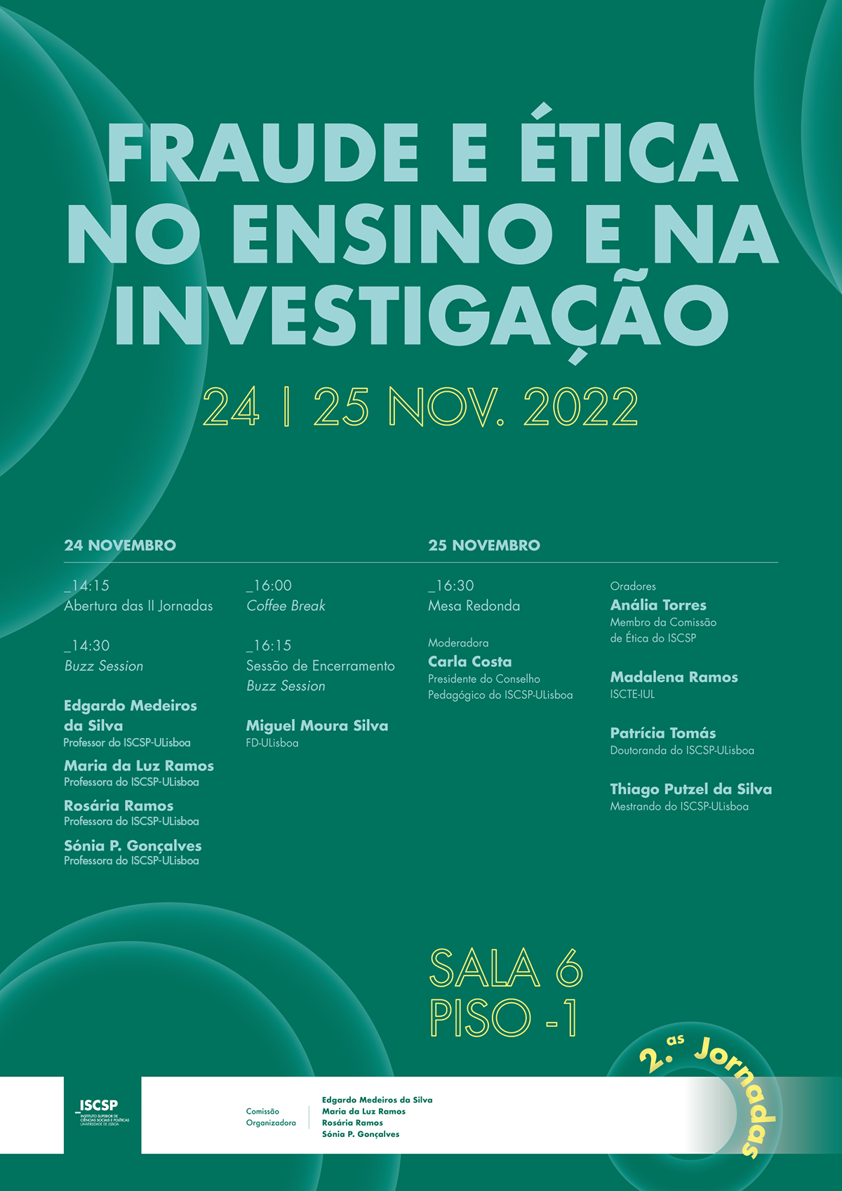 As Jornadas sobre Fraude e Ética no Ensino e na Investigação tem como principal objetivo proporcionar um espaço de debate aberto e franco entre estudantes e docentes do ISCSP-ULisboa, para esclarecimento de dúvidas sobre fraude académica no ensino superior e na investigação. O evento, organizado pelos Professores do ISCSP-ULisboa Edgardo Medeiros da Silva, Maria da Luz Ramos, Rosária Ramos e Sónia P. Gonçalves, pretende contribuir para a prevenção da prática de fraude no ISCSP-ULisboa.