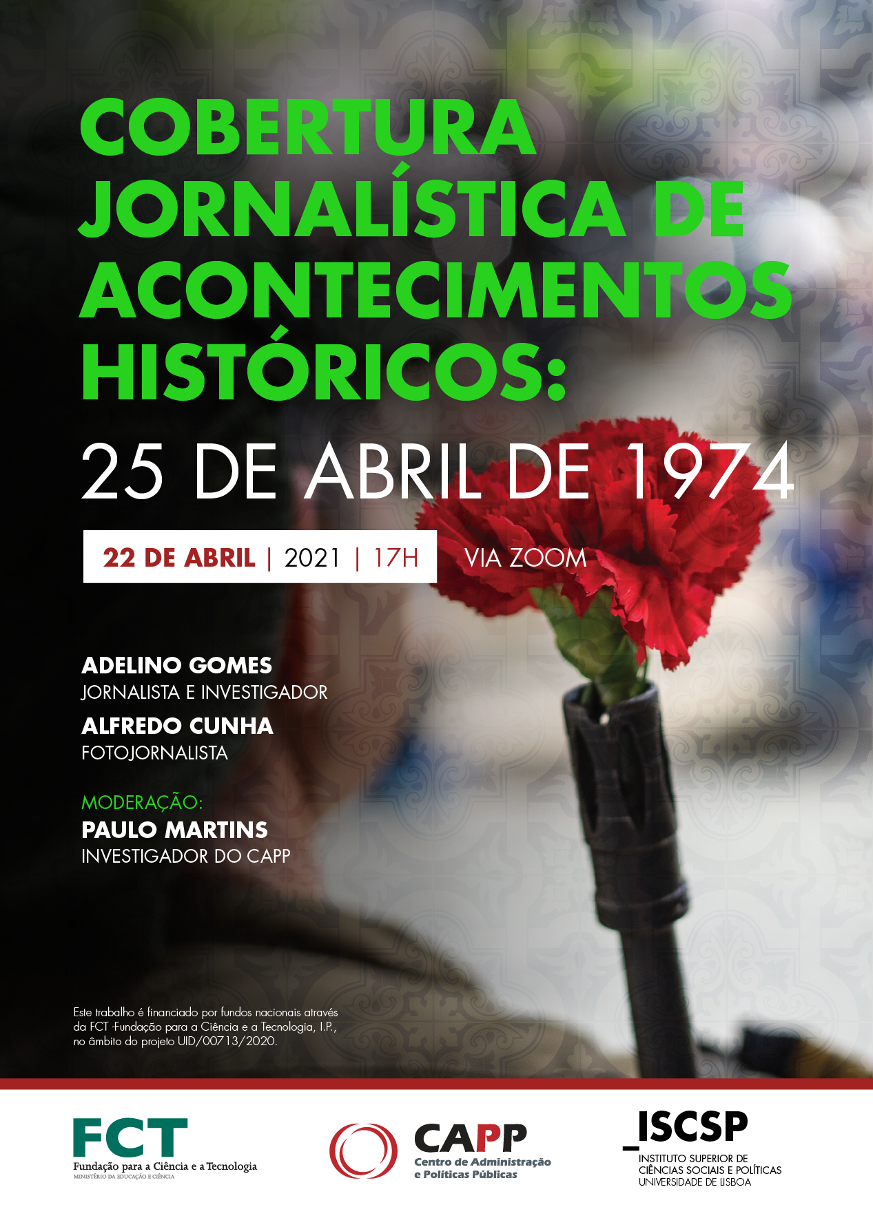 Decorre no dia 22 de abril de 2021, às 17 horas, a conferência “Cobertura jornalística de acontecimentos históricos: 25 de Abril de 1974”, que terá como oradores Adeline Gomes, jornalista e investigador, e Alfredo Cunha, fotojornalista, com moderação do Professor do ISCSP-ULisboa Paulo Martins.