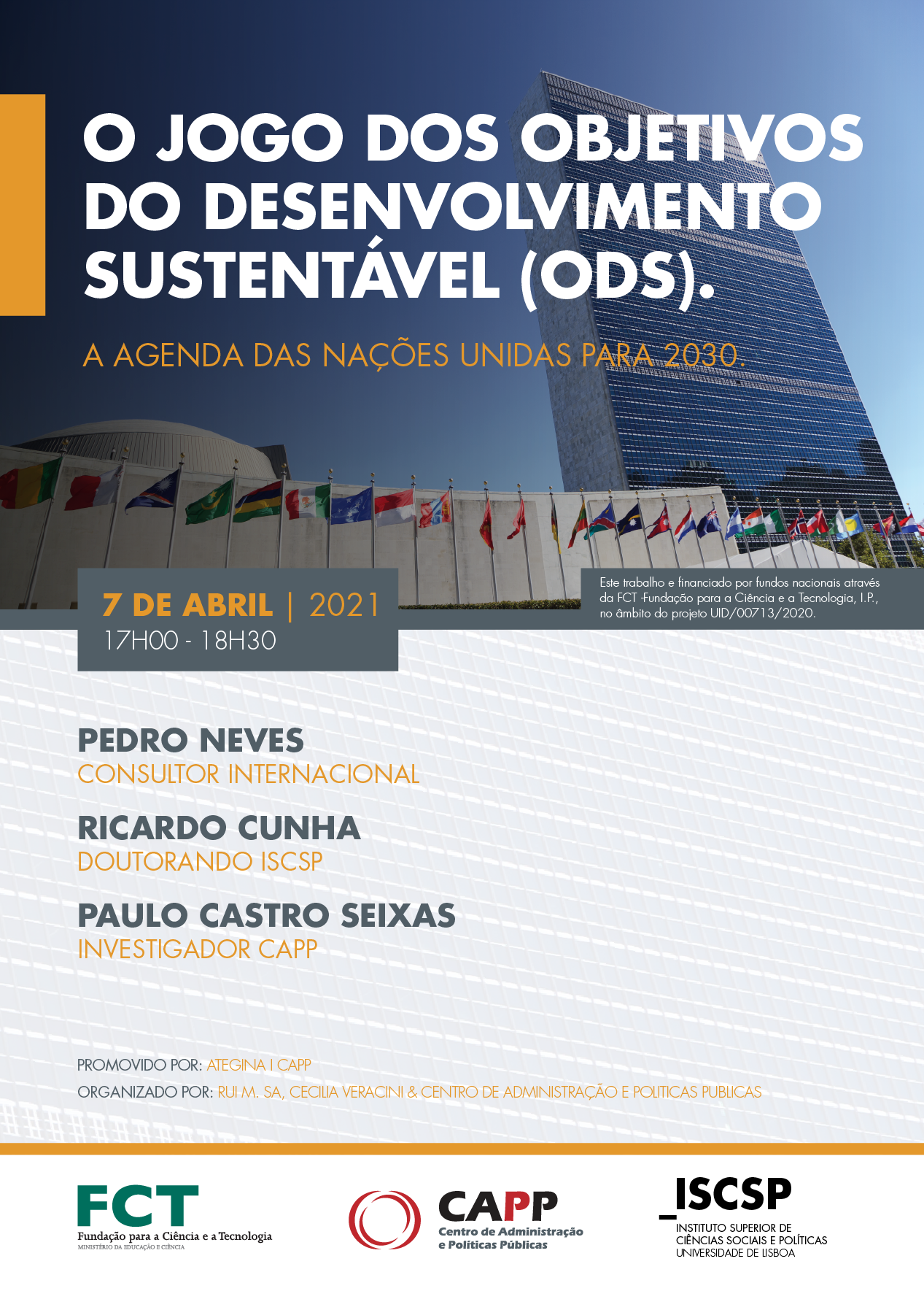 “O jogo dos Objetivos do Desenvolvimento Sustentável (ODS). A Agenda das Nações Unidas para 2030.” é o tema da conferência on-line, que se realiza no dia 7 de abril de 2021, às 17 horas, organizada pelo Centro de Administração e Políticas Públicas (CAPP) do ISCSP-ULisboa.