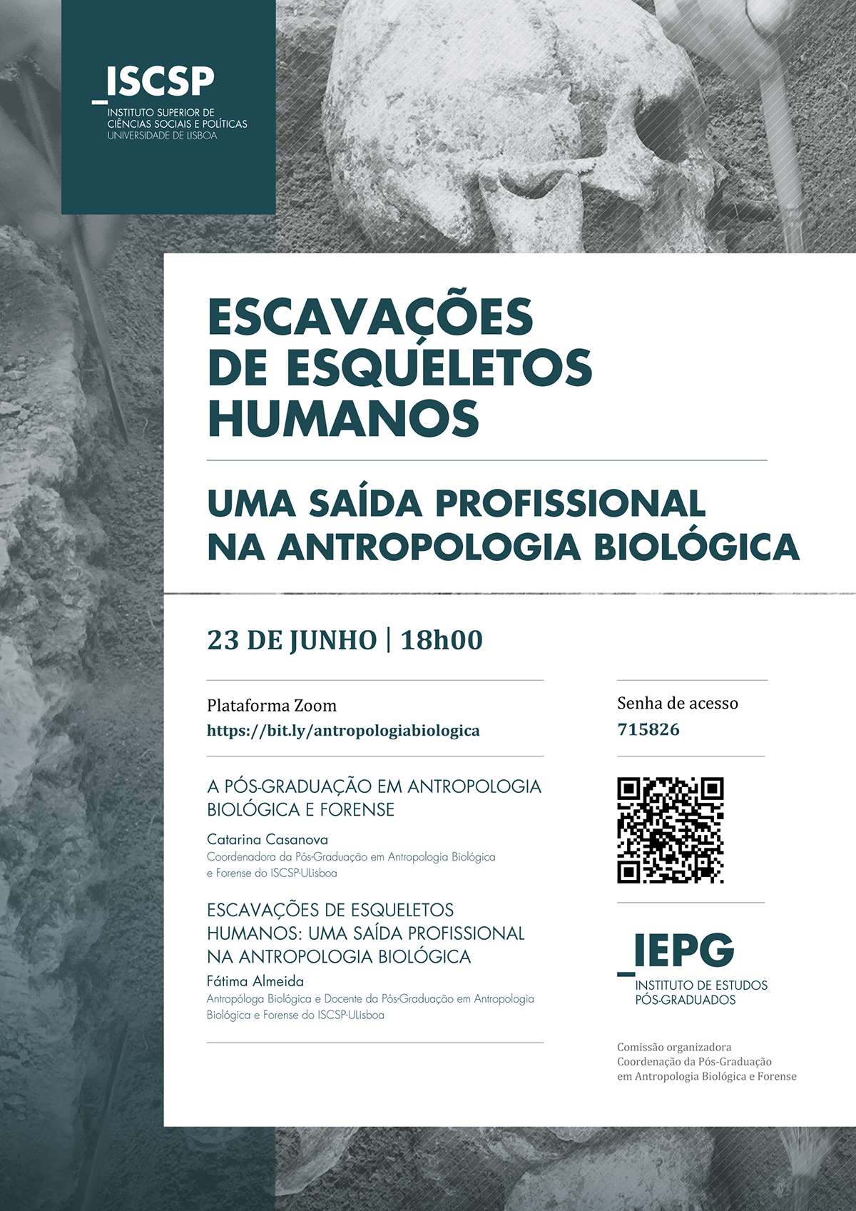 Conferência “Escavações de Esqueletos Humanos: uma saída profissional na antropologia biológica" - Cartaz (PNG) (1.63 MB)⇒ Conheça a pós-graduação em Antropologia Biológica e Forense aqui.