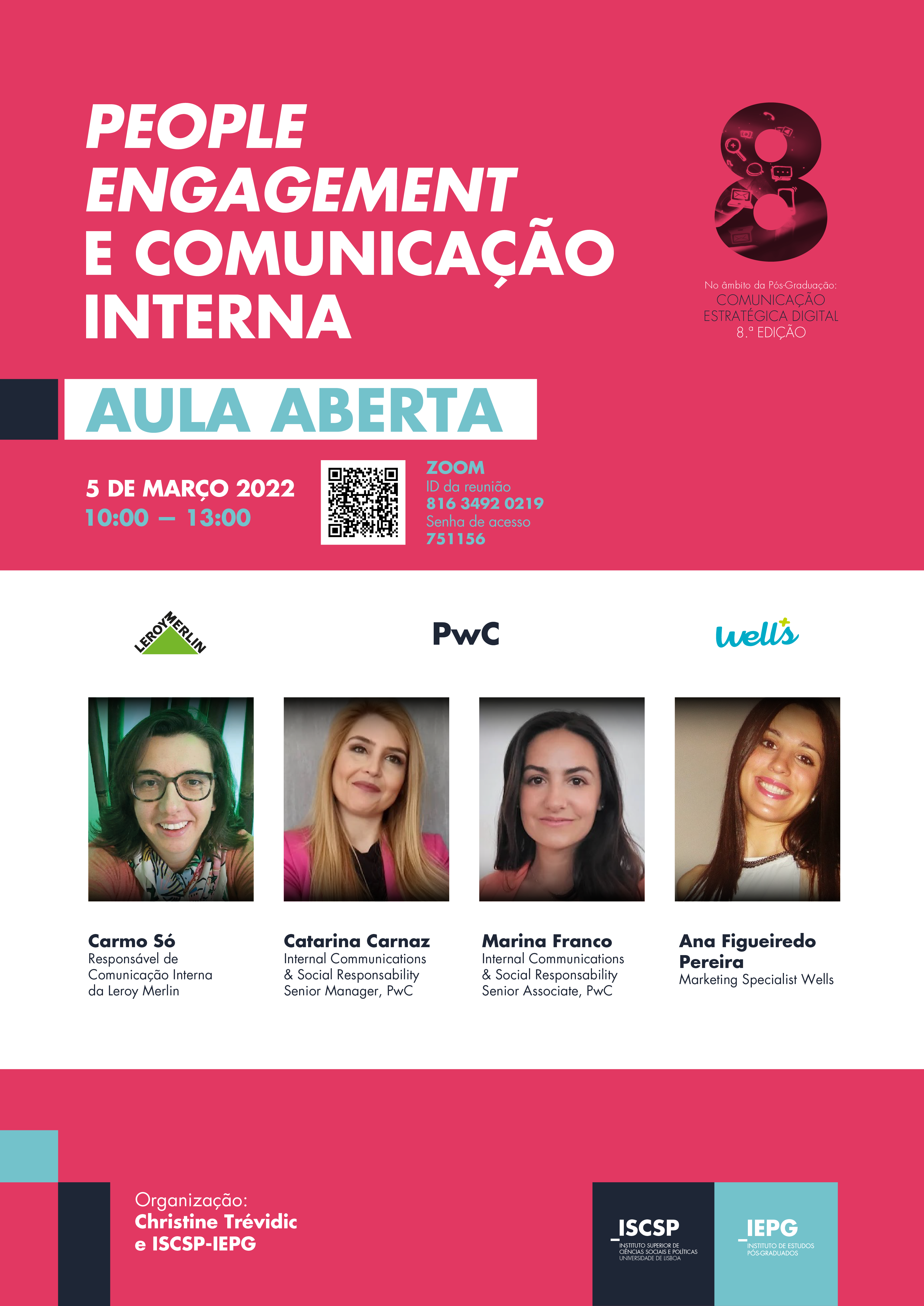 A aula é aberta a todos os alumni das anteriores edições da pós-graduação em Comunicação Estratégica Digital, bem como alunos das áreas de Ciências da Comunicação e de Recursos Humanos. Podem assistir através da Plataforma Zoom, com o link:https://videoconf-colibri.zoom.us/j/81634920219?pwd=WHVvTmR1Tk1XL1ZBZHJacm5SUy9qUT09; ID da reunião: 816 3492 0219; Senha de acesso: 751156.