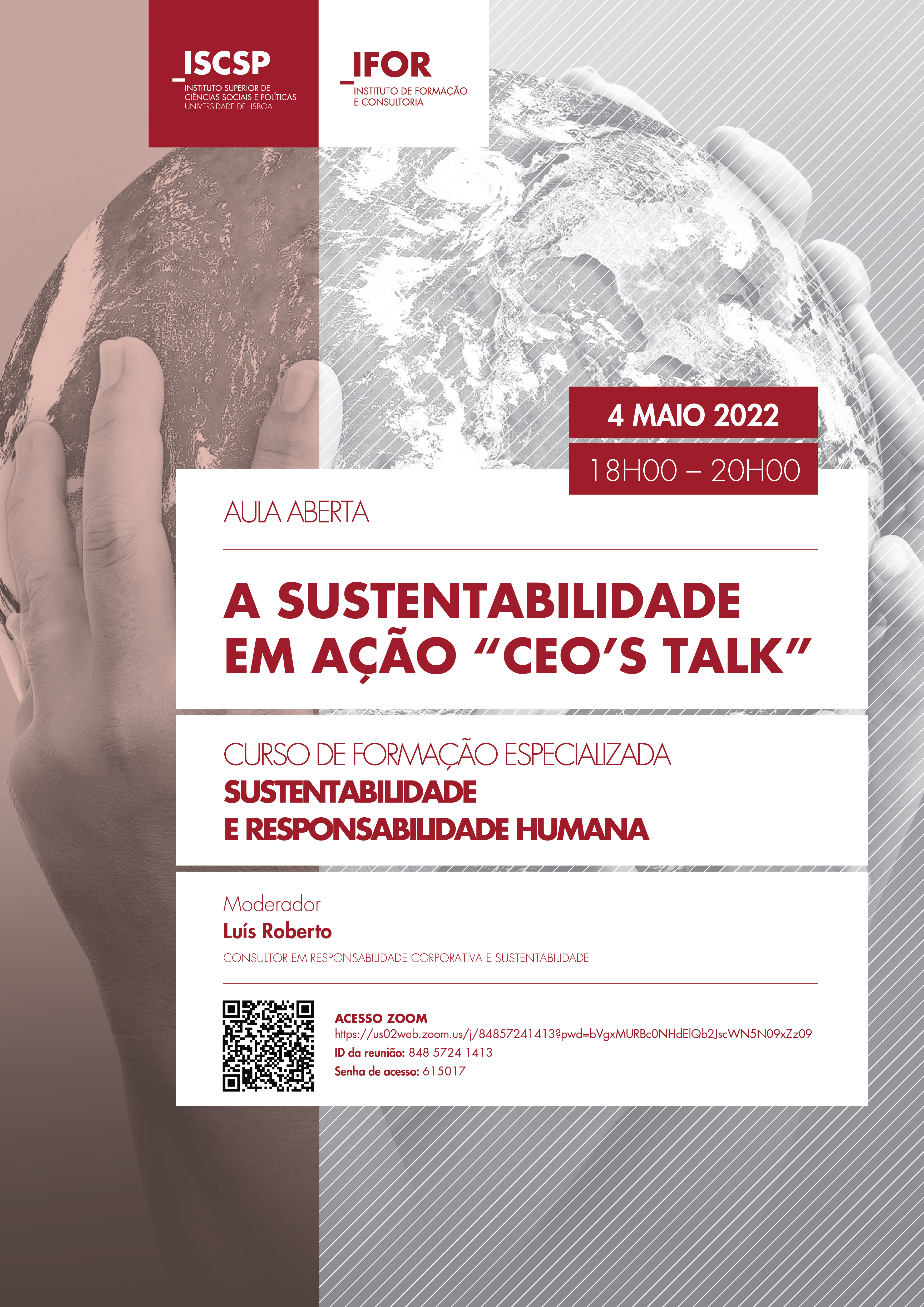 O Curso de Formação Especializada “Sustentabilidade e Responsabilidade Humana” do ISCSP-ULisboa promove a aula aberta sobre a temática “A Sustentabilidade em Ação "CEO’s Talk"”, no dia 4 de maio de 2022, às 18 horas, com transmissão online.