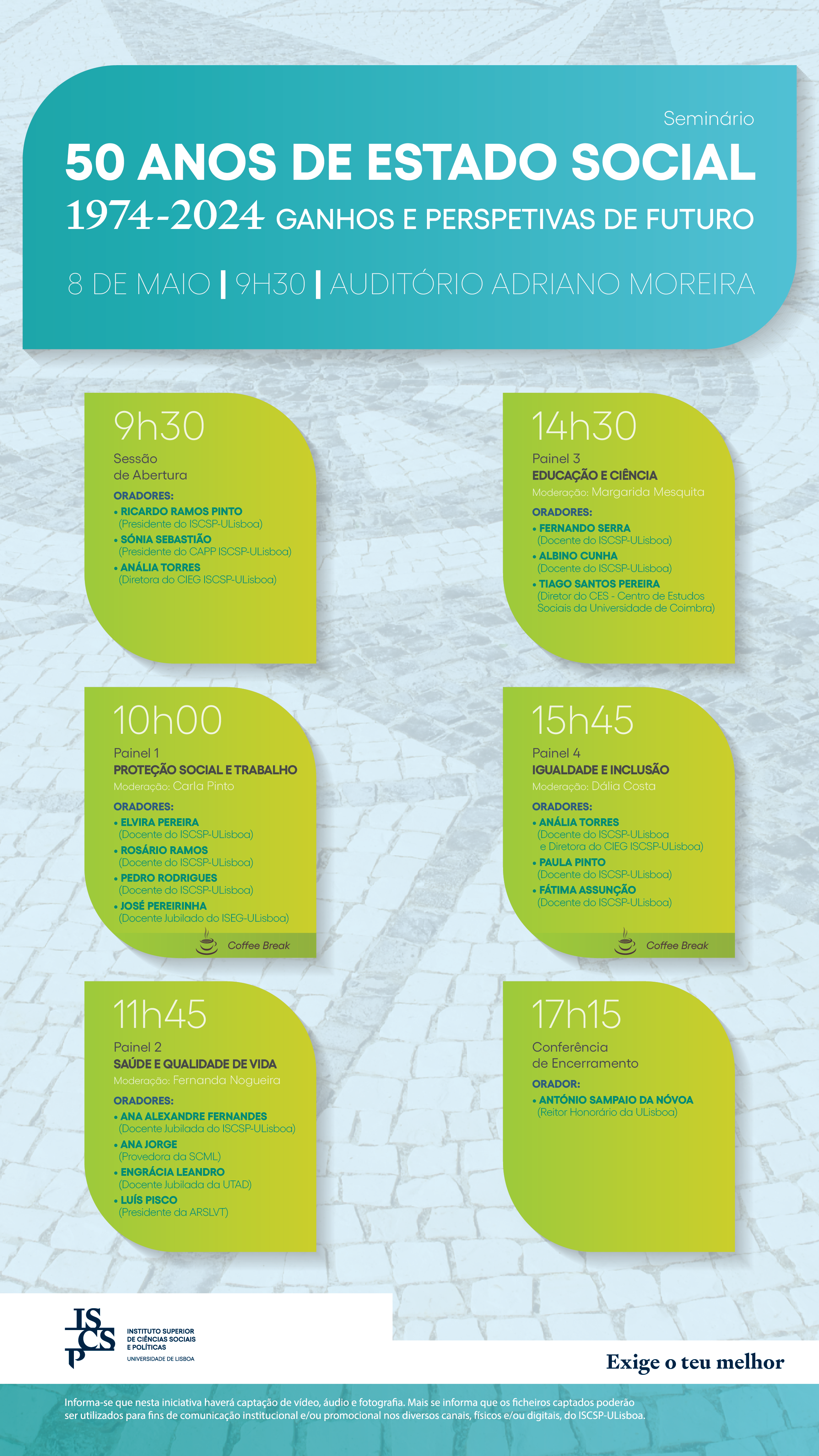 No próximo dia 8 de maio, irá decorrer o seminário "50 anos de Estado Social - 1974-2024 Ganhos e perspetivas de futuro", no Auditório Adriano Moreira.