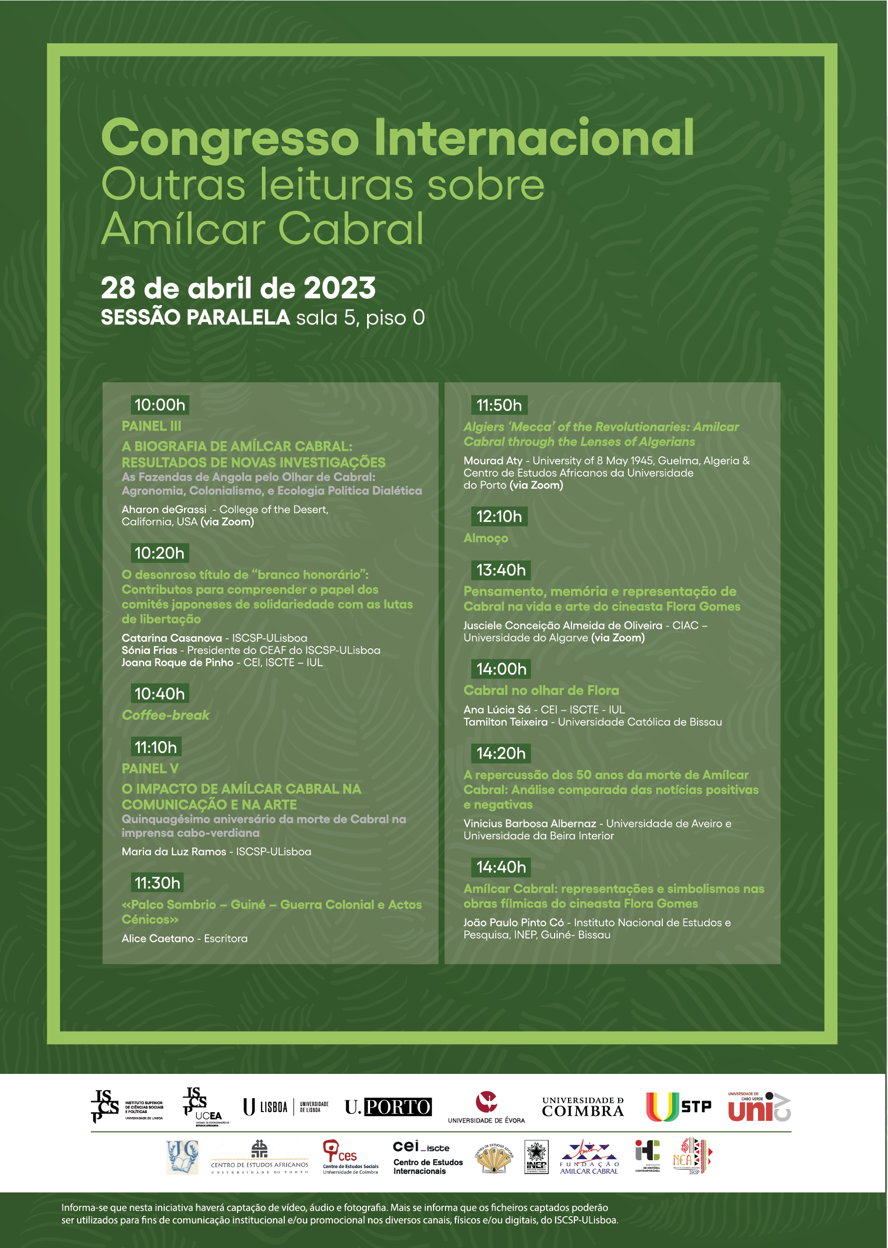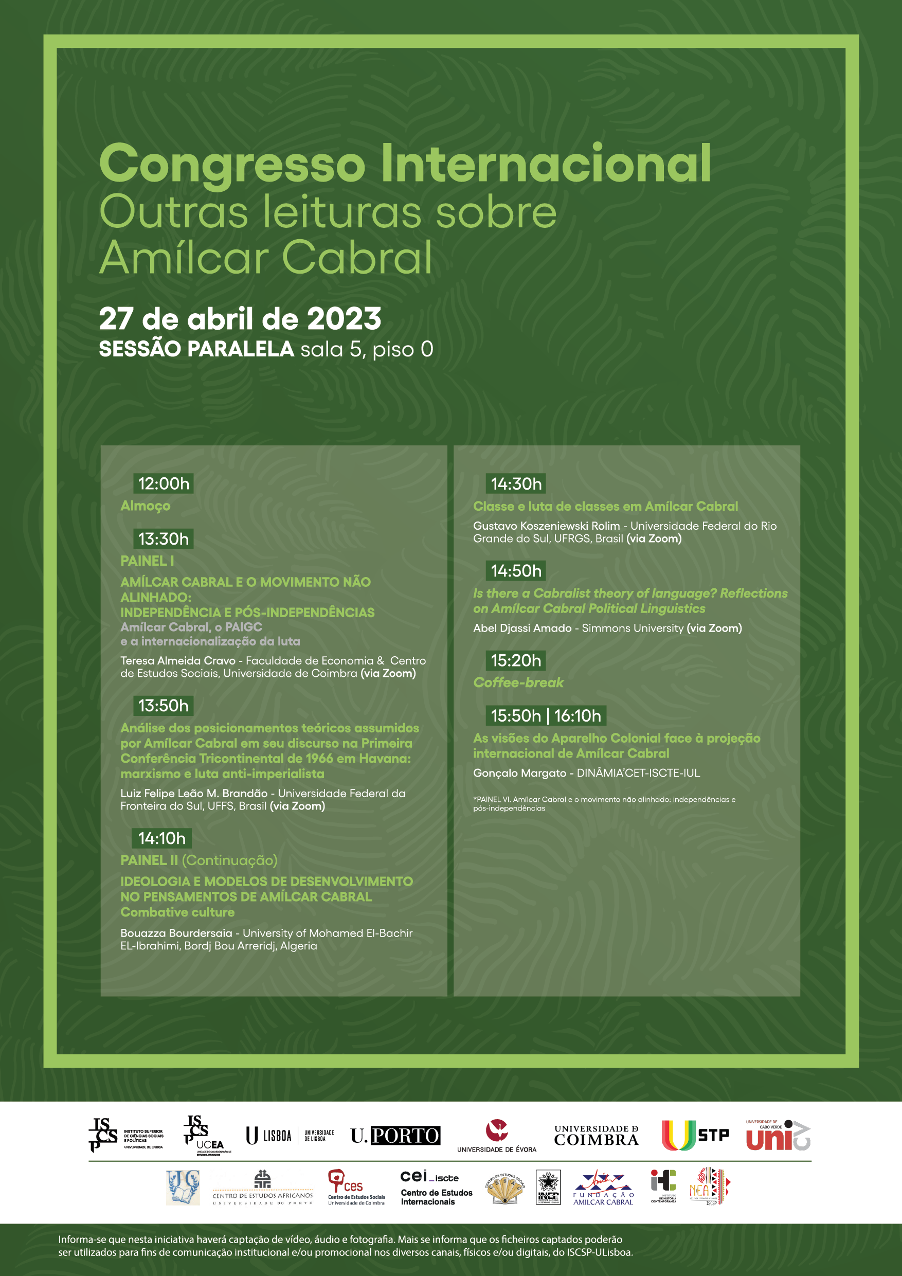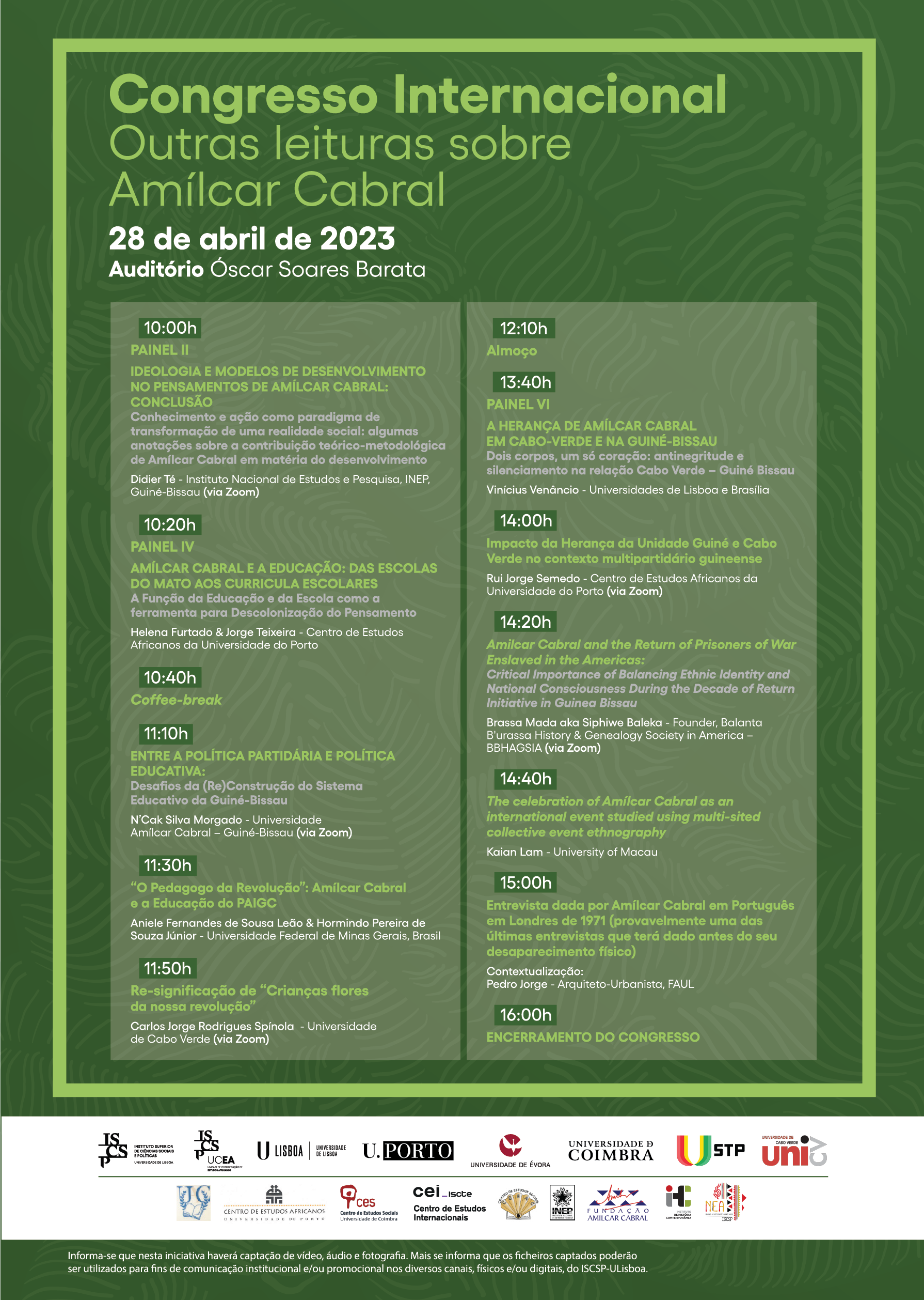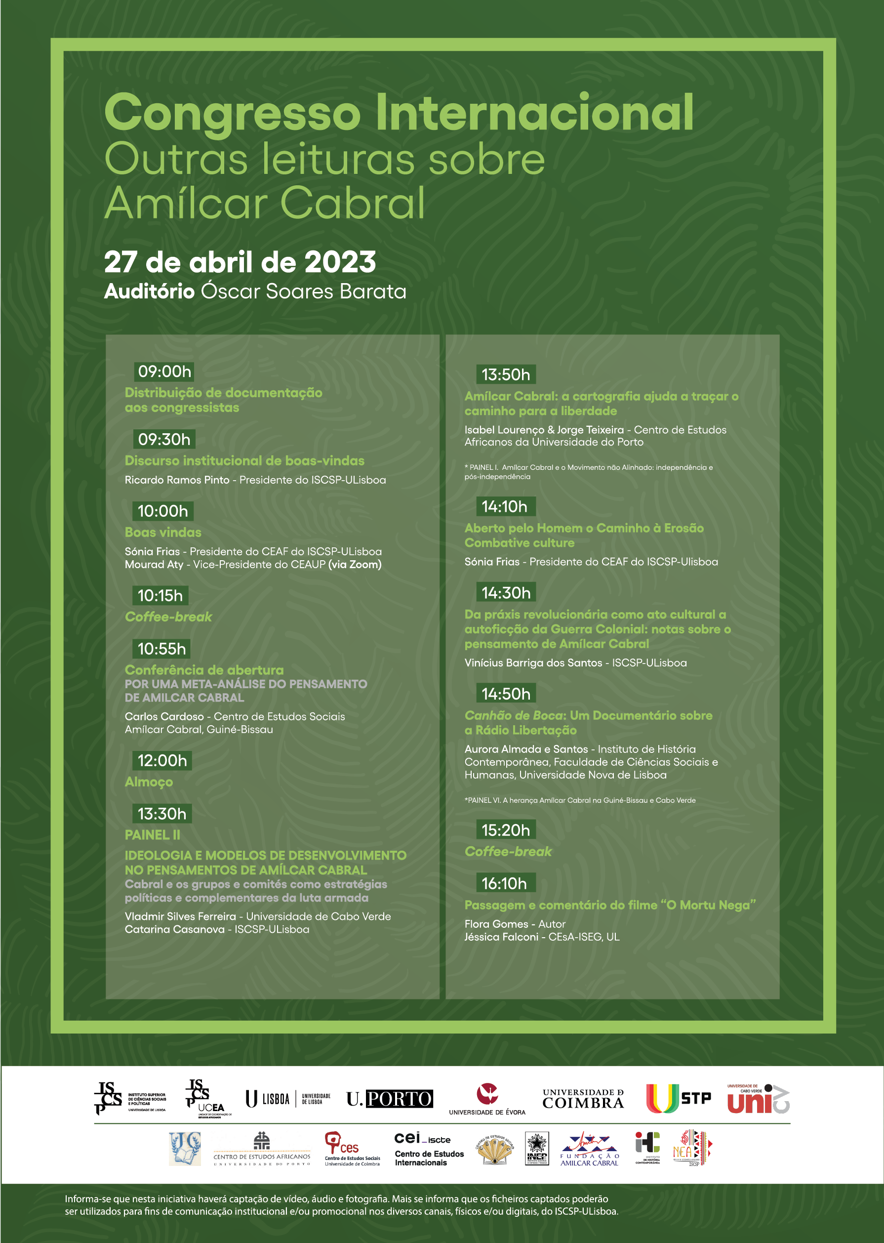 Programa Congresso Internacional Amílcar Cabral - 27abr - Auditório Óscar Soares Barata (PNG) (1.19 MB) rograma Congresso Internacional Amílcar Cabral - 27abr - Sala 5 piso 0 (PNG) (1.11 MB) Programa Congresso Internacional Amílcar Cabral - 28abr - Auditório Óscar Soares Barata (PNG) (1.30 MB) Programa Congresso Internacional Amílcar Cabral - 28abr - Sala 5 piso 0 (PNG) (1.19 MB)Informa-se que nesta iniciativa haverá captação de vídeo, áudio e fotografia. Mais se informa que os ficheiros captados poderão ser utilizados para fins de comunicação institucional e/ou promocional nos diversos canais, físicos e/ou digitais, do ISCSP-ULisboa.