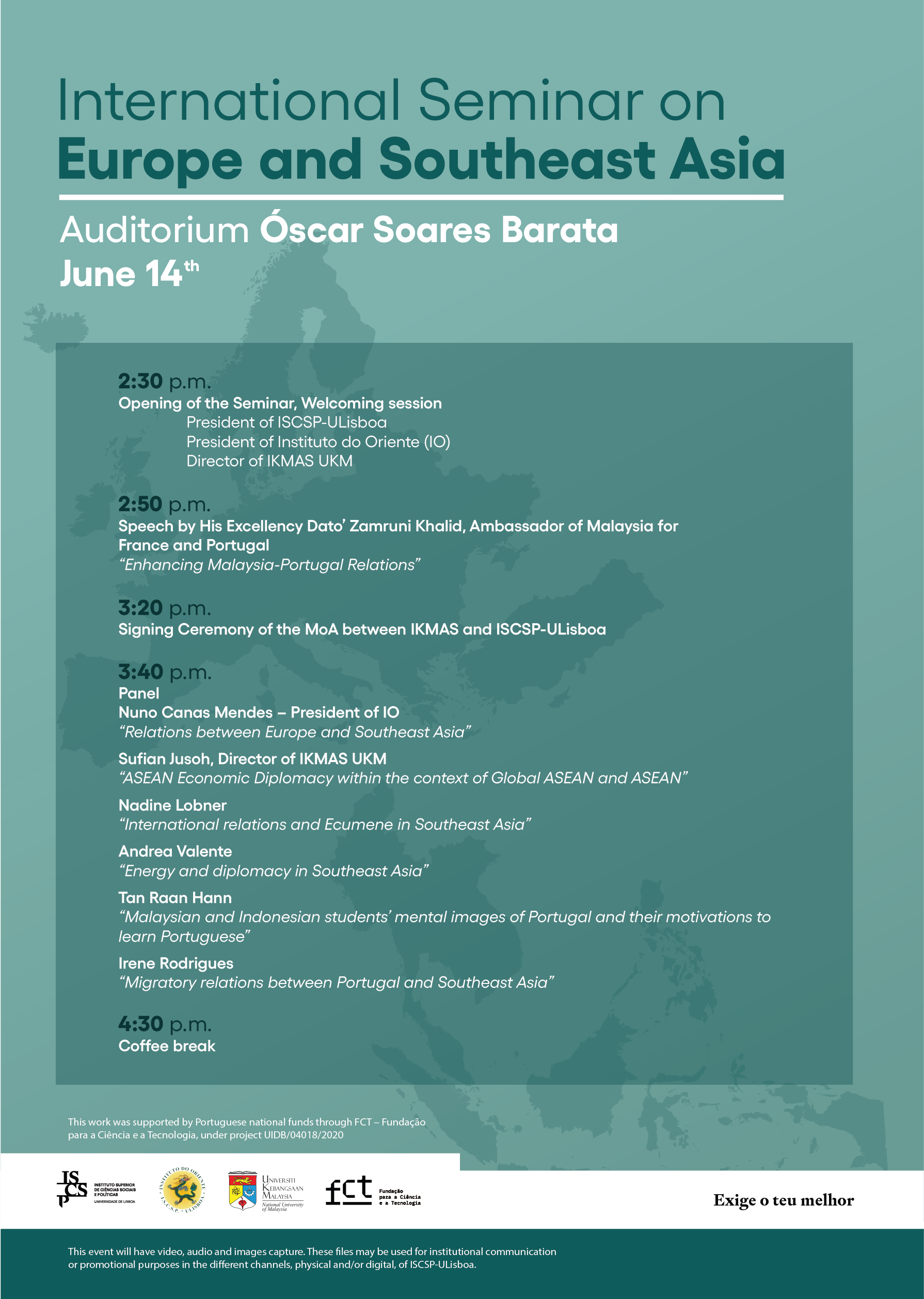 O Seminário Internacional “Europe and Southeast Asia” ocorre no próximo dia 14 de junho, no ISCSP-ULisboa, em parceria com oIKMAS, (Institute of Malaysian and International Studies) da Malasia National University, e assinala a assinatura de um protocolo entre este centro de estudos internacionais da Malásia e o Instituto do Oriente (IO), do ISCSP-ULisboa.