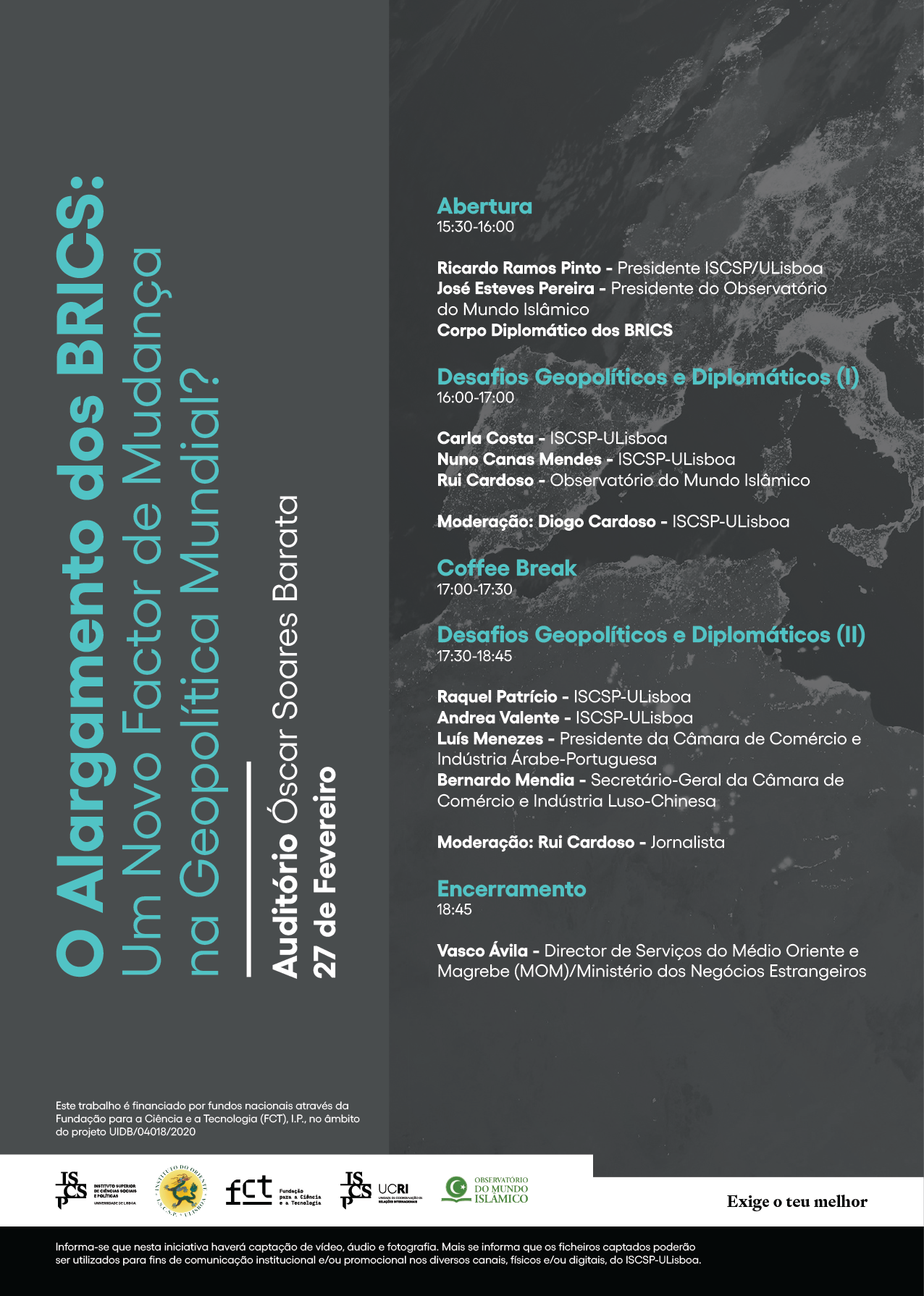 O grupo de países BRICS surgiu em 2009 e desde então afirmou-se no cenário internacional, contando com o recente expansão a 1 de janeiro de 2024 com a adesão da Arábia Saudita, Egito, Emirados Árabes Unidos, Etiópia e Irão). Este evento sobre os BRICS que desempenha um papel importante trata a relevância económica e geopolítica dos BRICS, aborda a consolidação desde a sua criação até ao processo de alargamento de 2024, através da apresentação de uma diversidade de perspetivas proporcionada por especialistas na área.